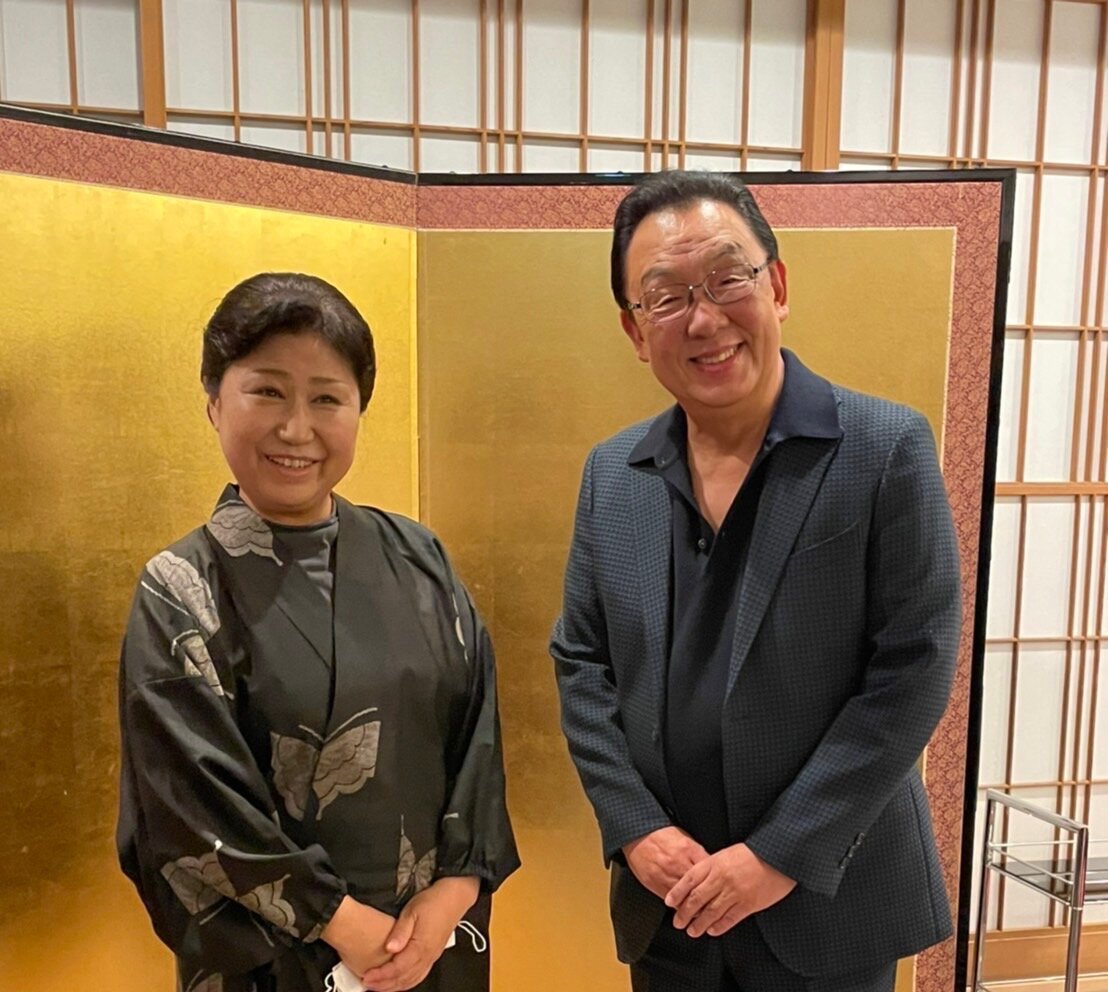 半玉さんと芸者衆と撮影後、梅沢富美男さんに記念写真をお願いして。